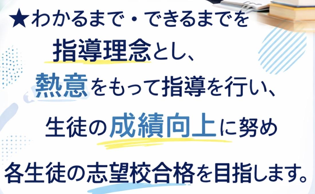 ★わかるまで・できるまでを指導理念とし、熱意をもって指導を行い、生徒の成績向上に努め各生徒の志望校合格を目指します。